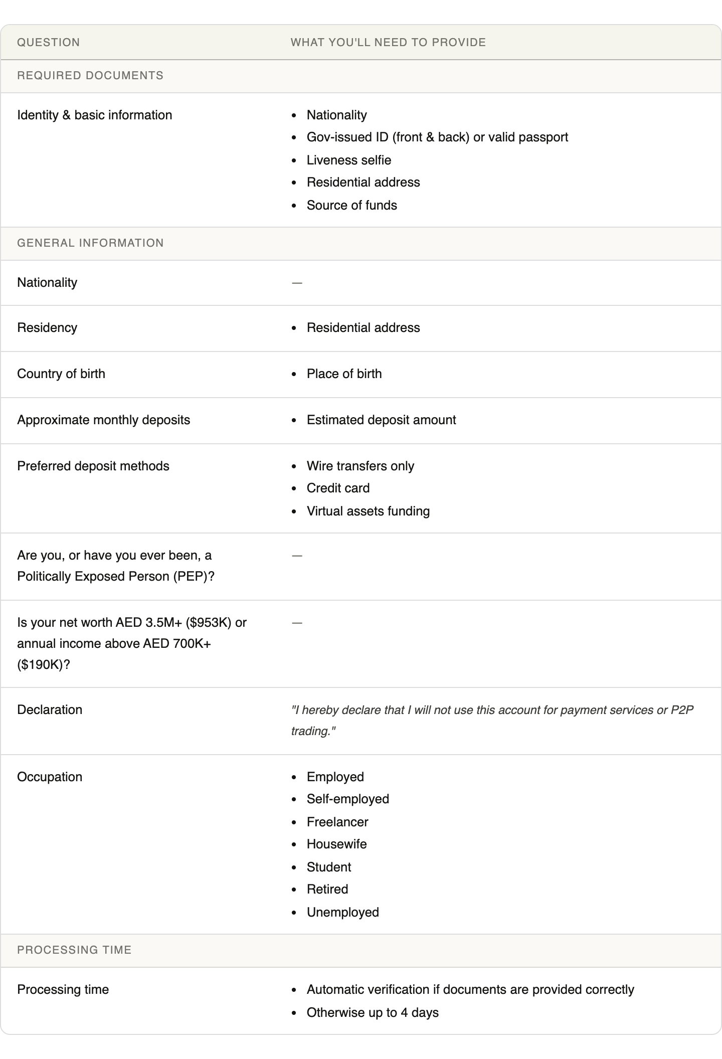 To get verified, you'll go through a single onboarding flow. Start by submitting your basic identity documents, then answer a short set of questions about your background, finances, and intended account use. Based on your answers, verification is either completed automatically or reviewed by our team within up to 4 days.
